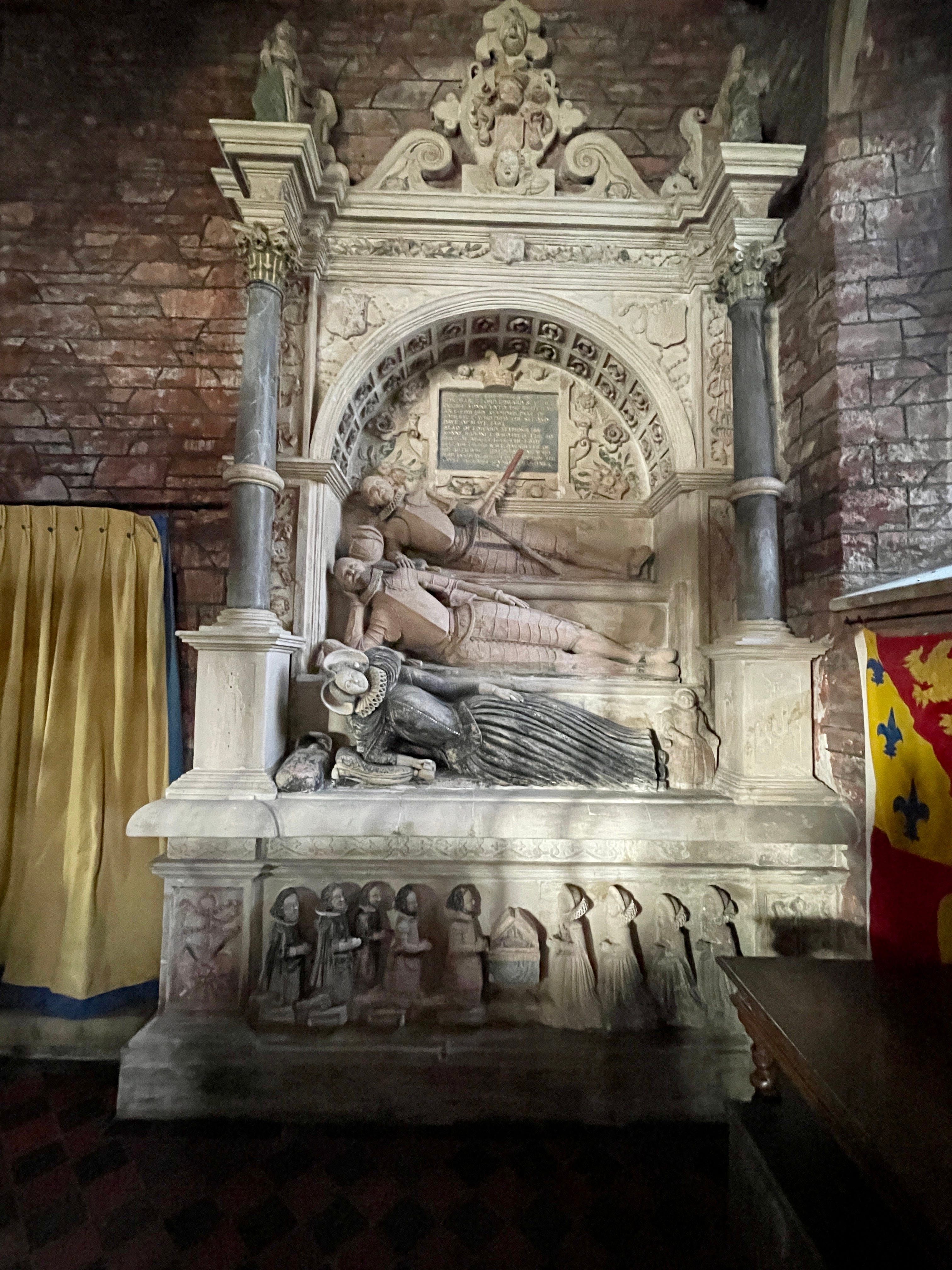 Elizabeth rests on an elbow, positioned below her husband and his father, who are both in armour. It is conceivable that the intent of this strange configuration was to emphasise that women held significantly less importance than men. But looked at another way, the monument might suggest that Elizabeth is supporting her menfolk.